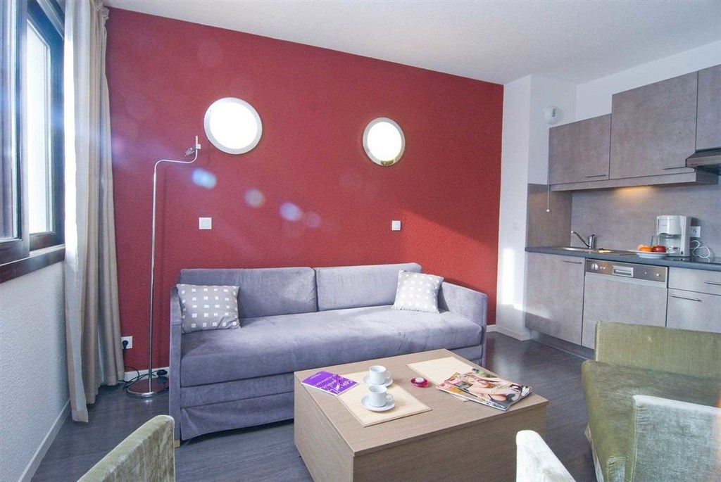 Ap 5 (cca 34 m²), obývací místnost s kuch. a jídelním koutem a rozkládacím gaučem pro 2 os. a dalším křeslem pro 1 os., v ložnici dvoulůžko nebo 2 samostatná lůžka, koupelna s vanou, WC (někdy oddělené), balkon nebo terasa.